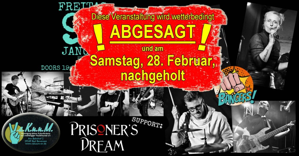 Nach reiflichen Überlegungen haben sich beide Bands nun doch entschlossen, die für heute Abend angekündigte Veranstaltung abzusagen. Das Konzert wird am Samstag, den 28. Februar, nachgeholt. Wir bitten um Verständnis. Euer VaKuuM-Team