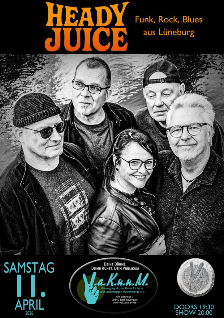 HEADY JUICE bringt druckvollen Groove in die Lüneburger Musikscene – funky, rockig, energiegeladen. Die fünfköpfige Band begeistert mit einer mitreißenden Mischung aus Funk, Rock und Blues nicht nur eingefleischte Musikfans und Tanzversessene.