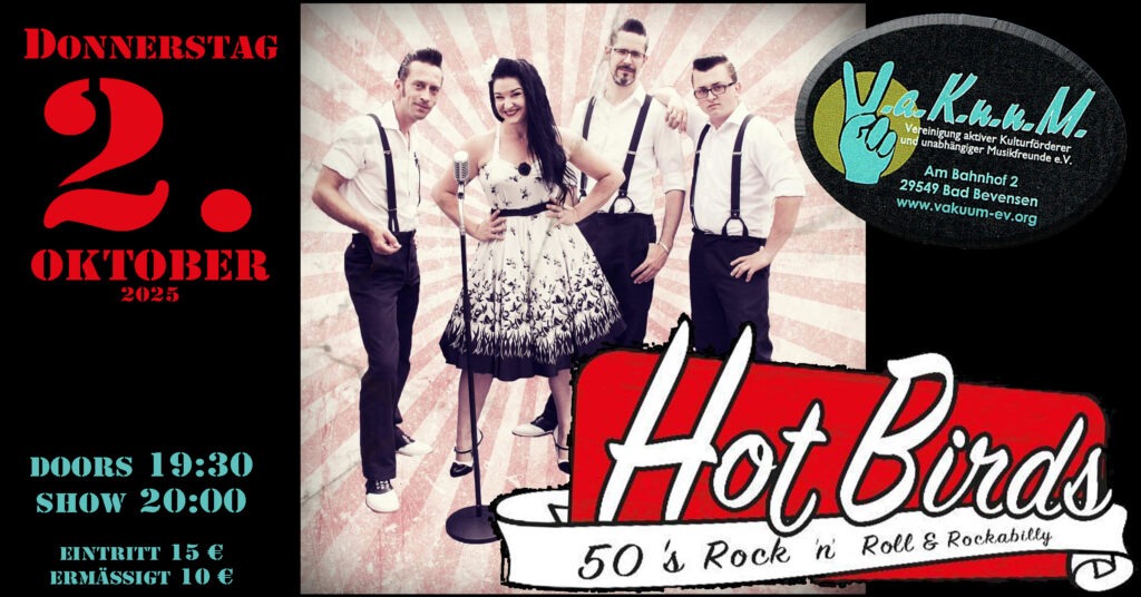 Mit Klassikern von Buddy Holly, Elvis Presley und vielen anderen Hits, präsentieren die Hot Birds eine musikalische Zeitreise. Eine Zeit, in der die Frauen noch Petticoats trugen, die Männer ihre Tolle kämmten und Amerika von Elvis überrollt wurde. Mit viel Rock n Roll, lustigen Anekdoten und dem Charme der 50er Jahre, begeistern die Hot Birds seit Jahren das Publikum.