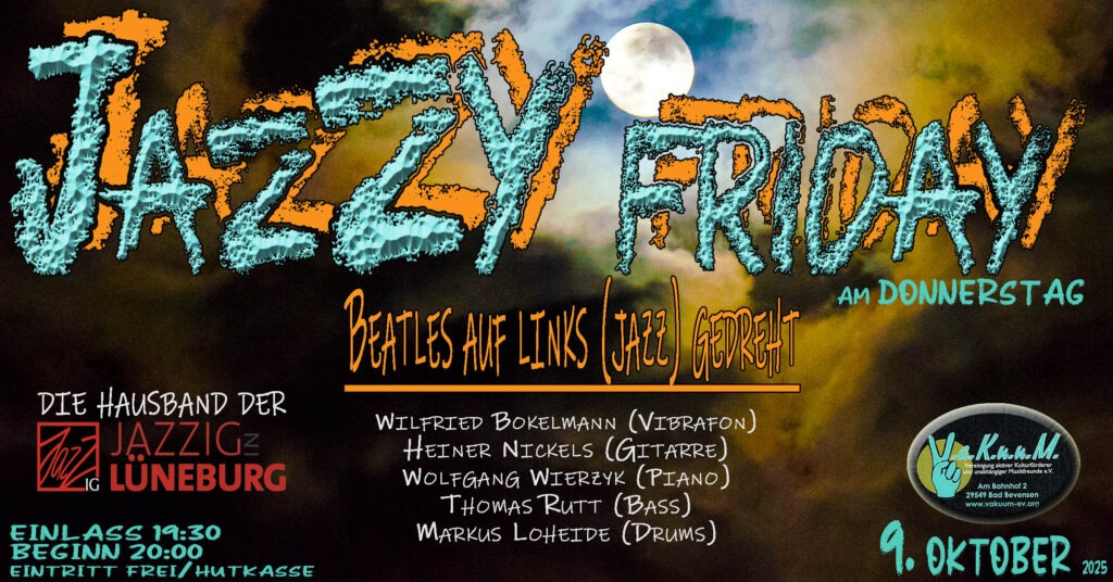 “Rubber Soul“ war 1965 das erste Album der Beatles, das als musikalische Einheit und nicht als Hitsammlung produziert wurde. Es enthielt innovative Songs wie z.B. Norwegian Wood und Michelle und zeigt die Weiterentwicklung der Beatles. 60 Jahre später hat die Hausband der Jazz IG Lüneburg weiter an den Songs der Beatles gedreht und in jazzige Arrangements verpackt – was die großartigen Melodien in ein anderes Licht rückt und einen neuen Blick auf die Songs bringt.
